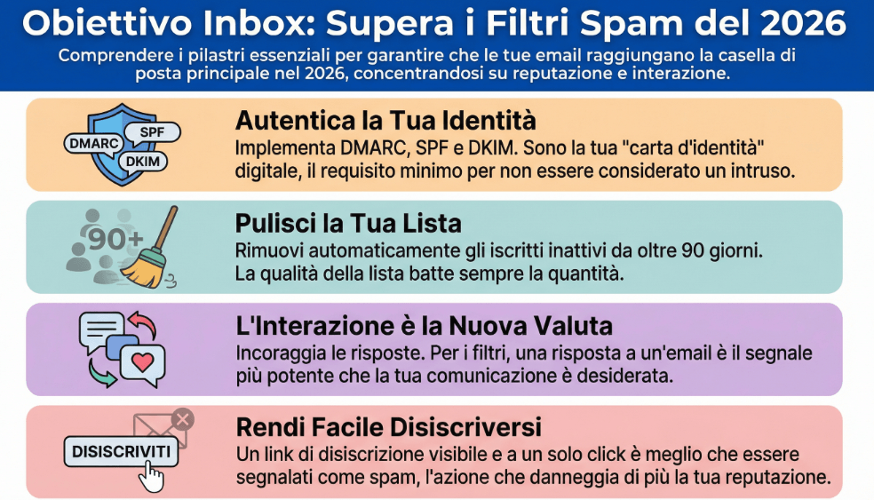 Una volta sistemata la parte tecnica, devi affrontare la sfida del comportamento umano. Nel 2026, i filtri spam non guardano solo cosa invii, ma come reagiscono i tuoi iscritti. Il quinto consiglio è dare priorità assoluta al tasso di risposta (Reply Rate). Gli algoritmi di Google e Outlook ragionano così: "Se un utente risponde a questa email, significa che la comunicazione è desiderata e umana". Incoraggia i tuoi iscritti a risponderti, magari facendo una domanda nel primo messaggio di benvenuto. Questo segnale di interazione è il "lasciapassare" più potente che tu possa ottenere.