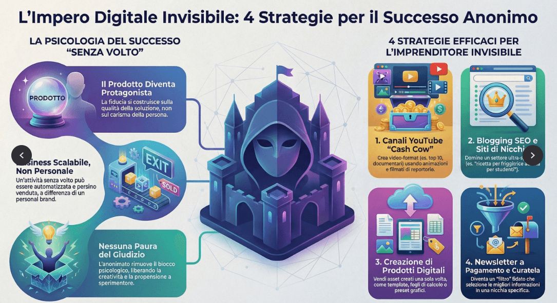 Viviamo in un'era digitale ossessionata dall'immagine. Sembra che per avere successo online si debba necessariamente diventare un "influencer", ballare davanti a una telecamera su TikTok, o vloggare ogni singolo istante della propria colazione su Instagram. Questa percezione, tuttavia, è una delle più grandi bugie del marketing moderno. La verità, quella che i "guru" dell'ego spesso dimenticano di menzionare, è che una fetta enorme dell'economia digitale è mossa da ingranaggi invisibili. Esiste un'economia sommersa, silenziosa e incredibilmente redditizia gestita da imprenditori che non hanno mai mostrato il loro volto al pubblico.