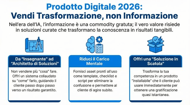 Per anni, il modello di business dominante è stato: "Io so qualcosa che tu non sai, pagami e ti darò le informazioni". Nel 2026, questo modello è ufficialmente morto. Con l'IA che fornisce risposte istantanee, tecniche e persino creative a costo zero, l'informazione è diventata una commodity. Vendere informazioni oggi è come cercare di vendere acqua accanto a una fonte pubblica gratuita. Ciò che invece è diventato rarissimo, e quindi preziosissimo, è il Contesto. I tuoi clienti sono paralizzati dall'abbondanza. Hanno mille strumenti ma nessuna direzione. Il prodotto digitale di successo nel 2026 è quello che prende per mano l'utente e gli dice: "Ecco i tre passi esatti per la tua situazione specifica, ecco i template pronti all'uso e ecco come evitare gli errori che l'IA non può prevedere perché non ha vissuto sulla propria pelle".