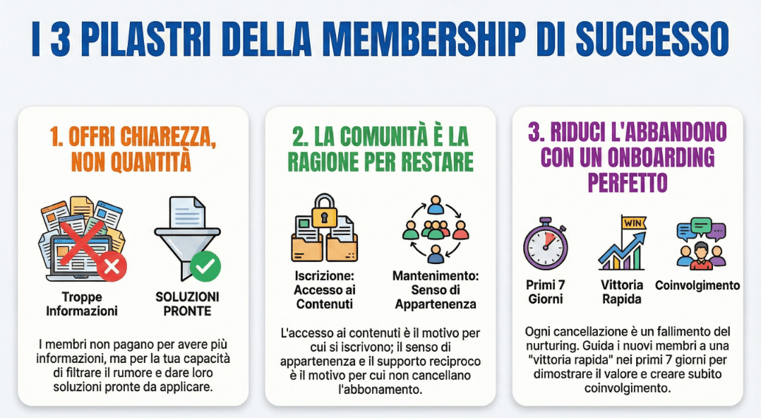 Molti credono che una membership debba essere costantemente riempita di nuovi contenuti per giustificare il costo. Errore. L'utente medio è già sommerso di informazioni. Il tuo compito non è fornire più roba, ma fornire chiarezza e applicabilità.